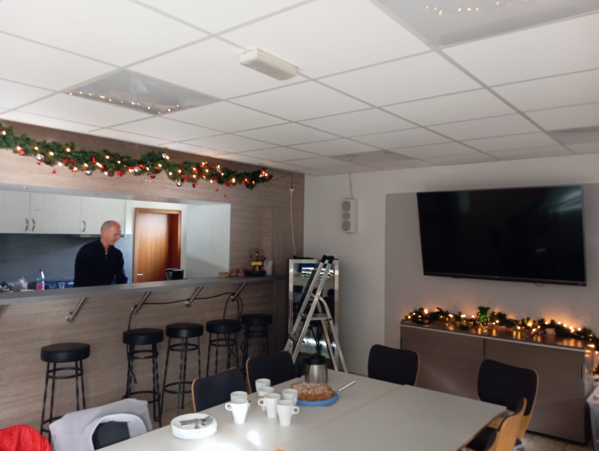 Gemeinsam machten sie sich daran, den Raum in stimmungsvolle Weihnachtsatmosphäre zu hüllen. Es duftet nach Tannengrün, während Lichterketten, Kerzen und liebevoll ausgewählte Dekorationen ihren Platz finden. Mit viel Freude, Kreativität und Teamgeist entstand so eine gemütliche, festliche Umgebung, die zum Ankommen und Wohlfühlen einlädt.